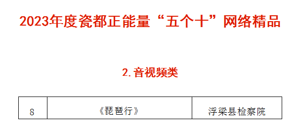 近日,由景德镇市网络安全和信息化中心开展的2023年度景德镇市瓷都正能量“五个十”网络精品和瓷都网络宣传“四个十佳”先进个人(账号)的评选活动揭晓结果,浮梁县人民检察院推送的微动漫《琵琶行》荣获2023年度瓷都正能量“五个十”网络精品。