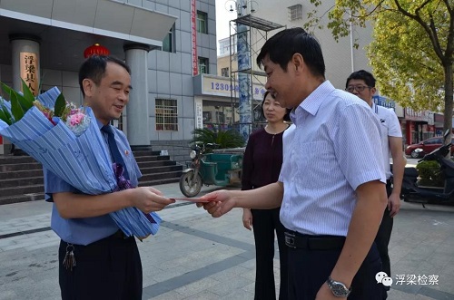 国庆前夕,9月27日,浮梁县政协主席陈国清来到县检察院走访慰问了该院干警林新平,为他送去慰问金,并赠送鲜花。