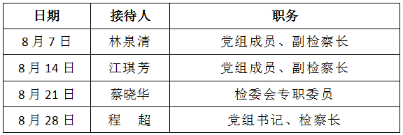 为深入贯彻习近平法治思想,践行以人民为中心的发展理念,提升12309检察服务中心服务质效和群众知晓度,扎实做好检察长接访工作,推动案结事了人和,现将本院2024年8月检察长接访安排公告如下:
