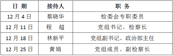 为深入贯彻习近平法治思想,践行以人民为中心的发展理念,提升12309检察服务中心服务质效和群众知晓度,扎实做好检察长接访工作,推动案结事了人和,现将本院2024年12月检察长接访安排公告如下: