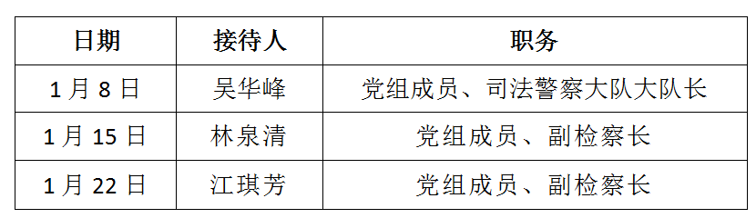 为深入贯彻习近平法治思想,践行以人民为中心的发展理念,提升12309检察服务中心服务质效和群众知晓度,扎实做好检察长接访工作,推动案结事了人和,现将本院2025年1月检察长接访安排公告如下: