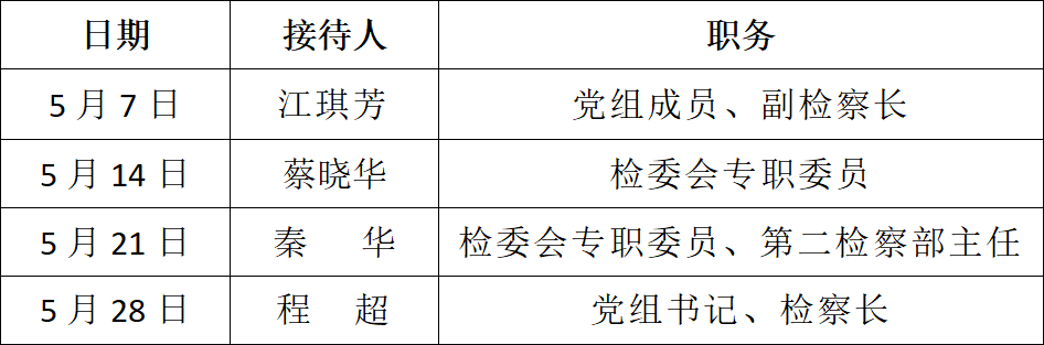 为深入贯彻习近平法治思想,践行以人民为中心的发展理念,提升12309检察服务中心服务质效和群众知晓度,扎实做好检察长接访工作,推动案结事了人和,现将本院2025年5月检察长接访安排公告如下: