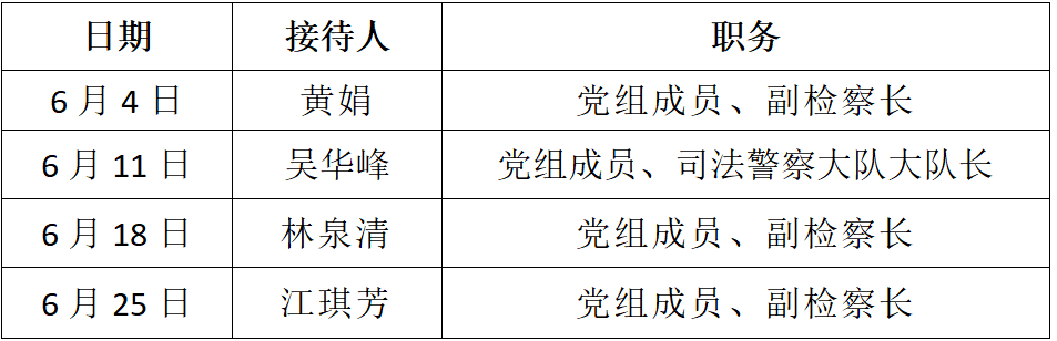 为深入贯彻习近平法治思想,践行以人民为中心的发展理念,提升12309检察服务中心服务质效和群众知晓度,扎实做好检察长接访工作,推动案结事了人和,现将本院2025年6月检察长接访安排公告如下: